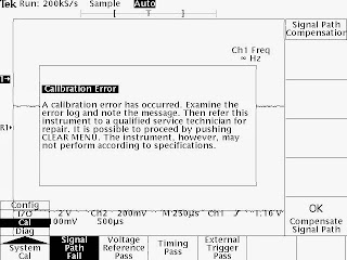 Thinking that the oscilloscope is out of calibration, I ran a self-calibration using the UTILITY menu, only to find out that things have gotten worse. The calibration process failed after 4 minutes and the oscilloscope reported problems upon power on: