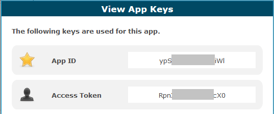 Once created, the app credentials and access tokens can be viewed by clicking on View Keys:
