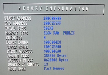 The Memory section reports 512KB chip RAM, 512KB slow RAM (from the trapdoor expansion slot) and 8MB fast RAM installed: