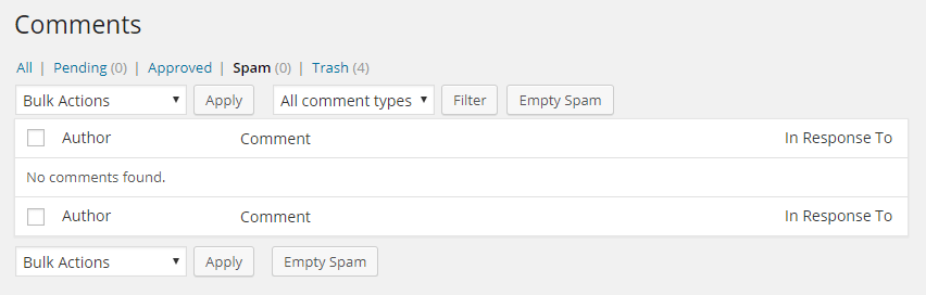 With this check, any comment that goes through the website comment form without the author URL field will be accepted. Automatic comments posted directly with links in the author URL field will be rejected with HTTP error 404. As most spammers will put links in this field, the modification will reject the majority of spam comments. Ever since this modification, my spam list has been empty most of the time: