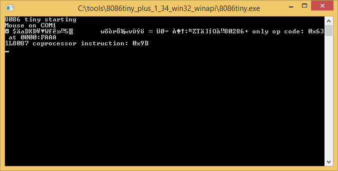 Although the emulator boots up from floppy just fine, it refuses to boot up from hard drive. When I attempted this, the emulator complained about “80286+ only op code” and “8087 coprocessor instruction” in the console: