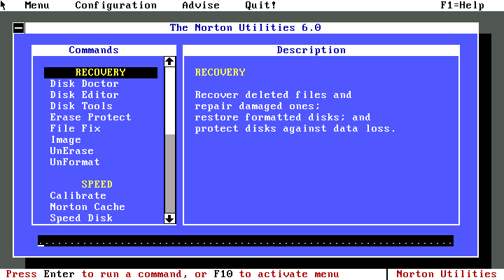 Because interrupt 10h with AX=1100h for setting custom video fonts requires at least an EGA card and does not work on CGA, when using Norton Utilities, dialog boxes and mouse cursor will be displayed using default font: