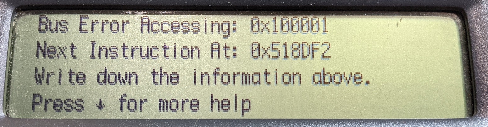 The error message reads “Bus Error Accessing: XXX. Next instruction at: XXX. Write down the information above. Press DOWN for more help. Email the information to support@renlearn.com. Press UP to see the previous message”. The system will then freeze and you will need to power cycle the Neo. The text file contents in RAM are still maintained. I guess this is the Neo equivalent of an address trap.