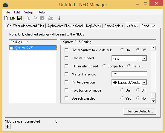 After that, connect your Neo and choose Setup > Reset all Neo devices which will install the patch ROM. You can also add something to the Send List and send it to the Neo, which will cause Neo Manager to install the latest ROM from the computer. When done, open the Preferences dialog again and uncheck the last option, otherwise Neo Manager will always attempt to flash the same patched ROM in future. Take note that the patched firmware is for System 3.15 US version only and similar steps must be done on other localizations or firmware versions. Also, the patched escape code works well on my printer but might need some tweaks to work with other printers. To test the escape codes, the best way is to use a Linux distribution such as Ubuntu and send raw text to the printer USB endpoint. If you are on Windows, raw printing is usually not allowed but can be worked around by sharing the printer on the network, mapped it via NET USE to something like LPT2 and use COPY CON from command line to print raw text file with escape codes. As usual, be very careful when flashing the firmware or else you may brick your Neo.