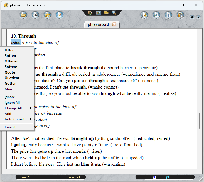 Despite the simple interface, features such as tables, embedded images, page break or equations (via MathType) are supported. There is even an offline thesaurus/dictionary feature which will launch the free Wordweb software, if installed: